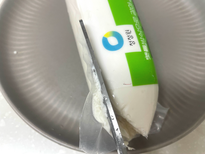 이럴 때 순두부 봉지에서 으깨짐 없이 꺼내는 간단 비법이 있어요. 일단 순두부 입구 부분을 살짝 잘라주세요.