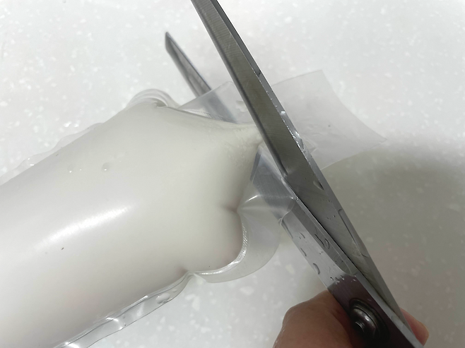 그다음 사이로 가위를 조심히 집어넣어 봉지 가장자리 부분을 잘라주세요. 최대한 끝가장자리 부분을 잘라주셔야 합니다.