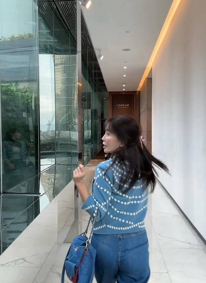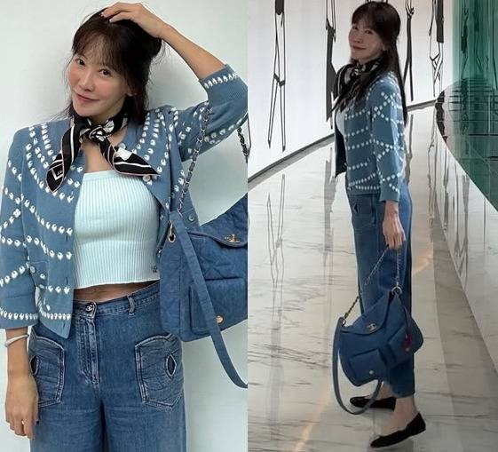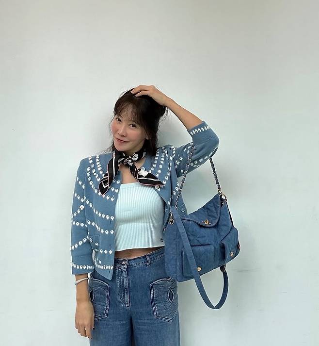 배우 김정은은 블루 톤을 중심으로 전체적인 스타일에 통일감을 주었습니다.
