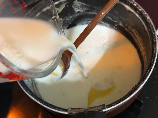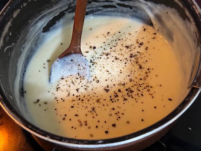 소금 후추로 간을 하면 화이트 그레이비 소스 완성 입니다.