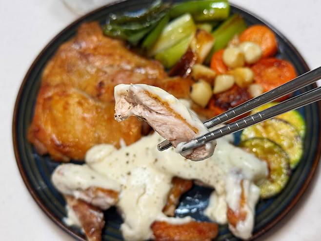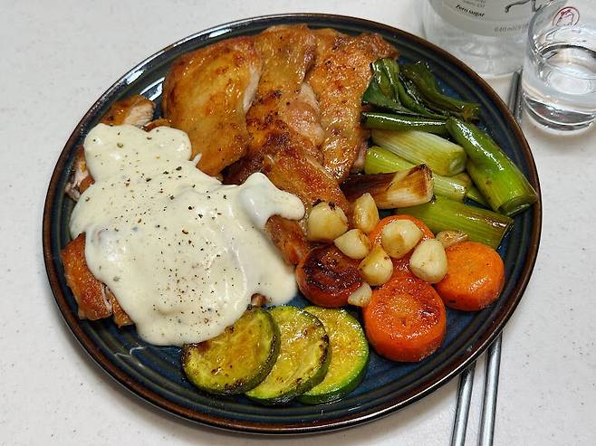 치킨스테이크에 구운 채소와 화이트 그레이비 소스 곁들이고,