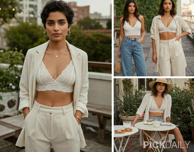 요즘은 브라렛을 속옷이 아닌 스타일로 활용하는 경우도 많아졌죠. 어깨 끈이나 디자인이 예쁜 브라렛은 오히려 살짝 보이게 연출하는 게 트렌드가 됐어요. 단, 너무 튀는 색상보다는 모노톤이나, 어두운 톤의 컬러를 고르면 어떤 옷과도 무난하게 어울릴 수 있습니다.