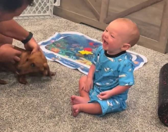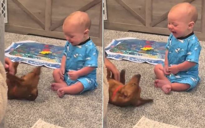 닥스훈트 강아지는 그저 아기 주변에서 뒹굴렀을 뿐인데 무엇이 그렇게 재미있고 좋은지 어린 아들은 내내 소리 내며 웃느라 바빴는데요.