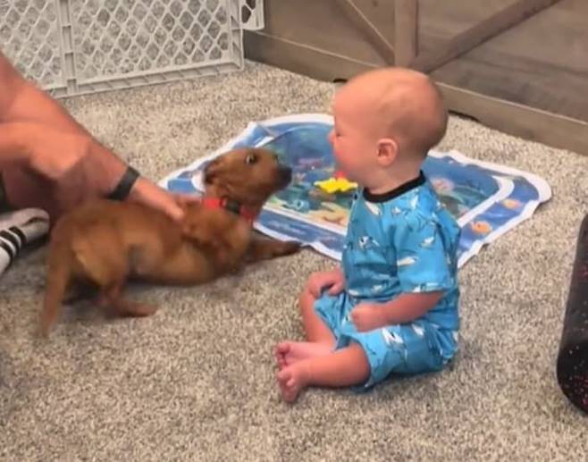 생후 6개월에 접어든 어린 아들은 과연 닥스훈트 강아지를 보고 어떤 반응을 보였을까. 정말 놀랍게도 어린 아들은 무서워하기는 커녕 오히려 좋은지 연신 웃음을 터뜨렸죠.