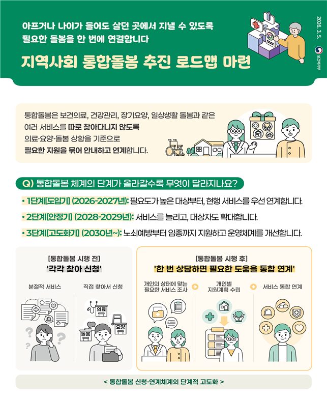지역사회 통합돌봄제도는 고령화 심화와 복합적 돌봄수요 증가에 발맞춰, 기존에 따로따로 제공되던 의료·요양 등 돌봄서비스를 통합적으로 연계하기 위해 도입됐다. 그간 준비과정을 거쳐 오는 27일 전국적으로 시행될 예정이다.