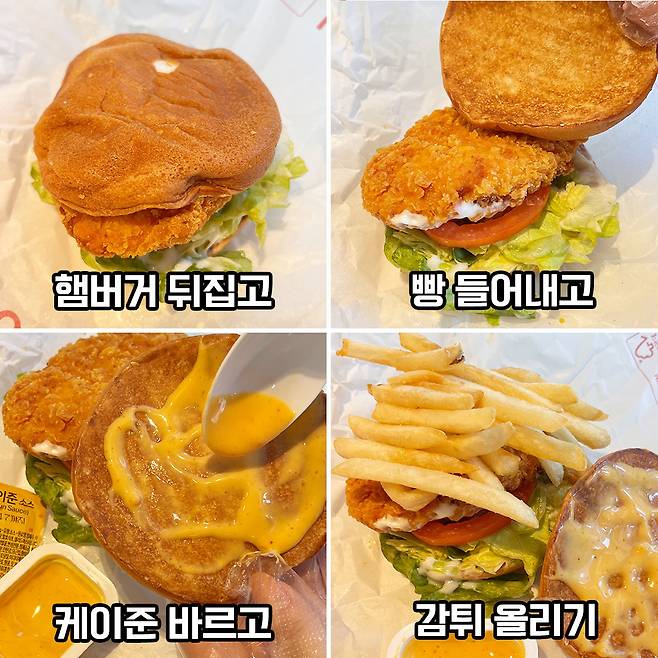 대망의 맥날 전설의 레시피 대공개! 햄버거를 뒤집어서 밑에 깔린 빵을 들어내줘요. 빵에 케이준 소스를 한 겹 발라준 후에 감튀를 올려서 닫으면 끝! 넘 쉽죠?