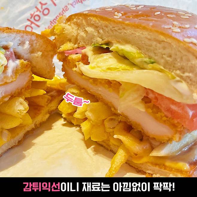 감튀 좋아하는 밥심은 감튀 탑을 쌓았어요ㅋ.ㅋ 확실히 내용물이 더 풍성해 보이고 먹음직스러워 보이지 않나요? 달콤한 마요 소스에 다양한 야채들과 어우러지니 정말 맛있어 보여요~