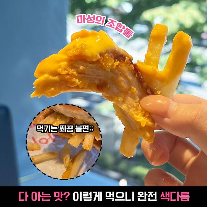 먹다보니 감자튀김이 자꾸 집을 나가려고 해서 고생 좀 했슴다 휴~ 요기서 꿀팁은 감자튀김 대신 해쉬 브라운을 넣기. 해쉬 브라운은 먹기도 편하고, 게다가 바삭한 맛까지 더해져 또 다른 재미가 있대요~