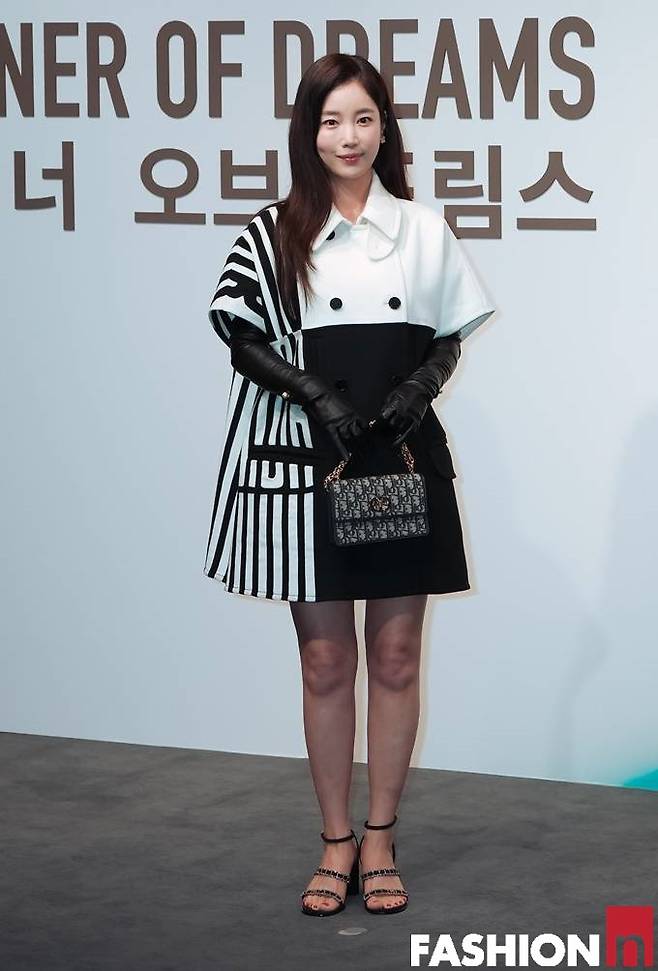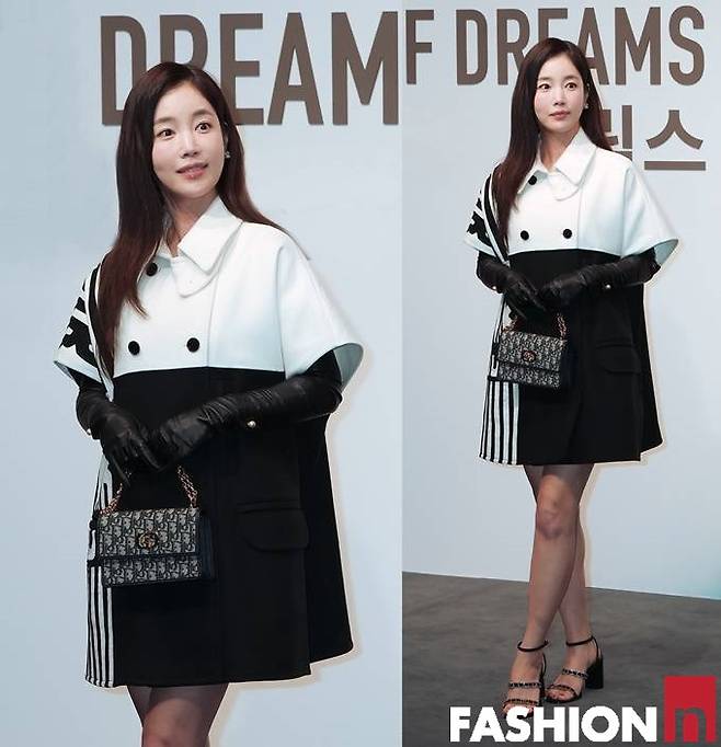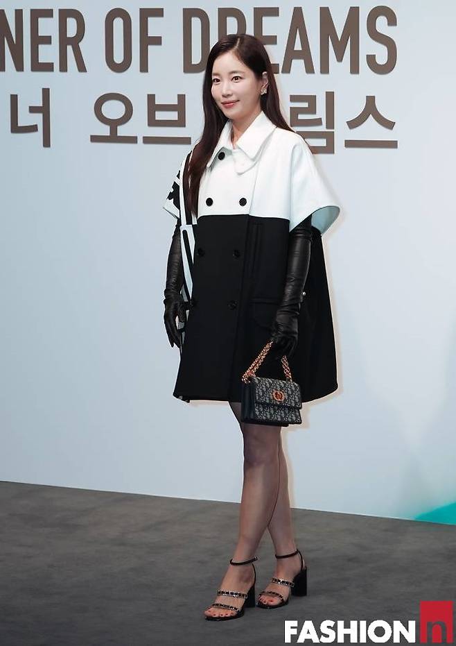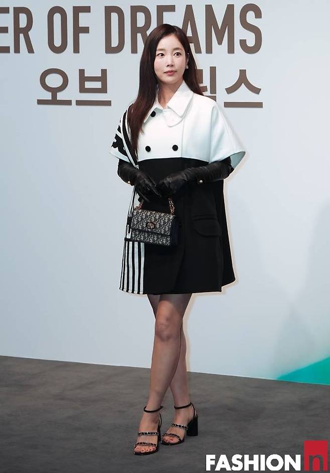 기은세는 이날 블랙과 화이트, 스트라이프가 동시에 다채롭게 블록 처리된 클래식한 원피스룩으로 눈길을 사로잡았다.