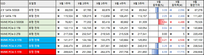 인터페이스/용량별 가격 동향은, 2.5인치 SATA SSD 500GB -3.08%, 1TB -2.05%, PCI Express Gen3 SSD 500GB +5.84%, 1TB -0.04%. 2TB +0.00% PCI Express Gen4 1TB +3.21%. 2TB -3.29% PCI Express Gen5 SSD는 1TB -6.59% 로 집계됐다.