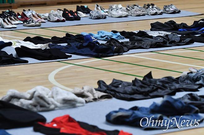 | ▲ 1일 오전 서울 용산구 원효로 다목적 실내체육관에 이태원 압사 참사 관련 유실물센터가 마련되어 옷, 신발, 가방 등 유실물들이 놓여 있다. |