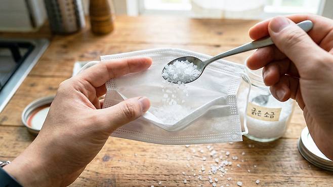 마스크 부직포는 공기는 통과시키면서 내용물을 잡아주는 구조다. 이 구조가 소금을 담아두기에 적합한 환경을 만들어준다. 간단하지만 효율적인 조합이다.