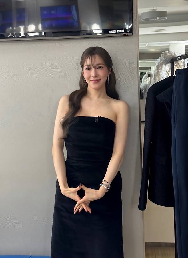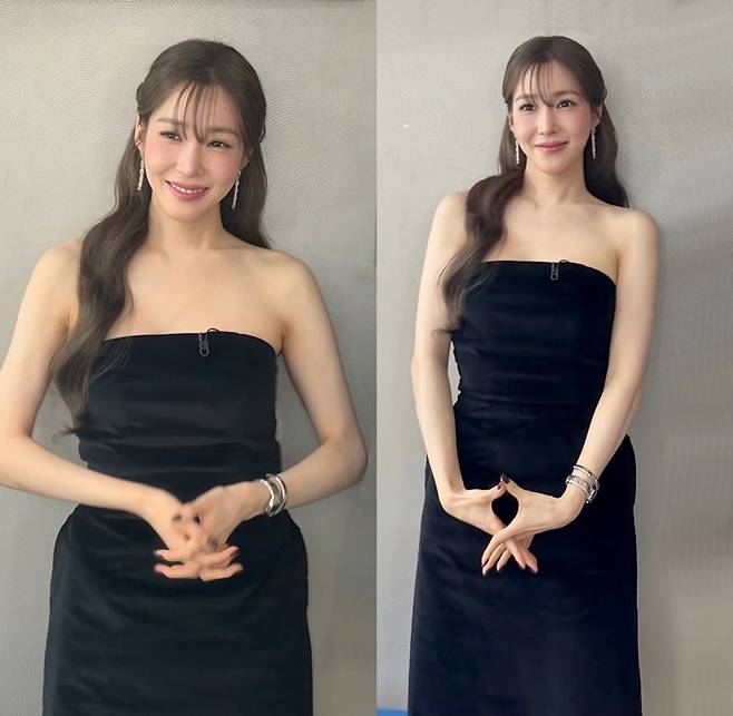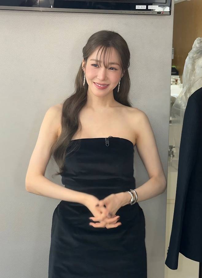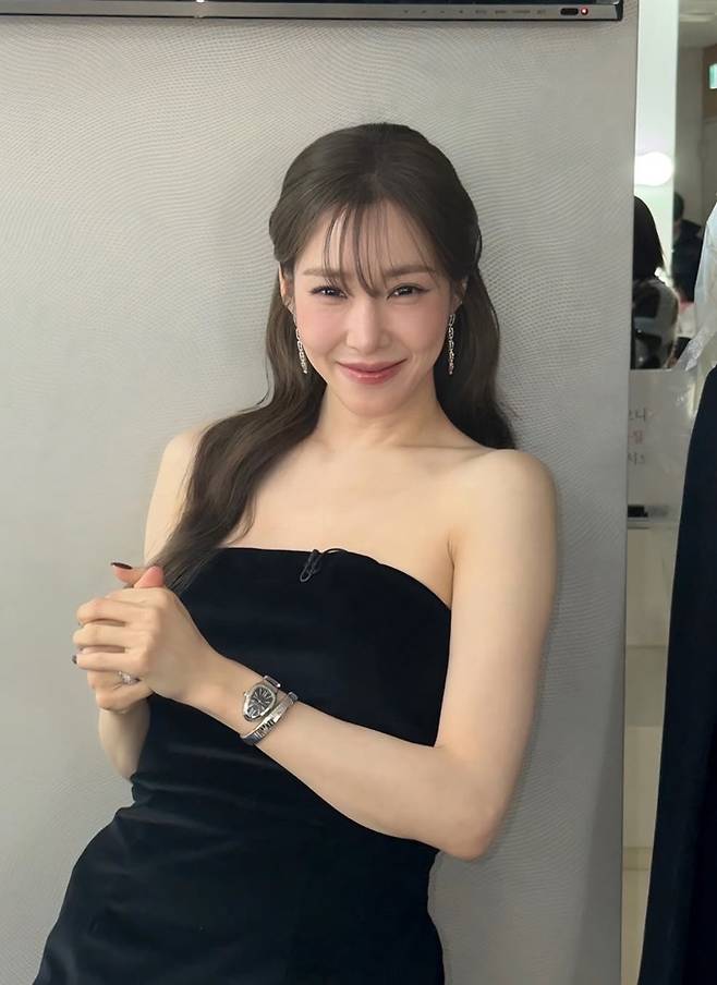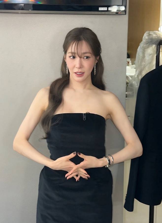 공개한 사진에서 티파니영은 쇄골 라인이 드러난 블랙 튜브 톱 드레스룩으로 슬림한 실루엣을 드러냈다.