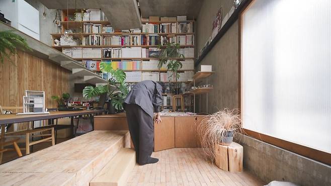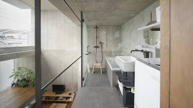 낮은 단차로 침대, 로우 테이블, 수납 가구를 배치해 저중심 생활이 가능합니다. 인접한 샤워실은 유리 파티션으로 가볍게 구획해 개방감을 유지했고, 길게 난 상부 창이 모든 공간을 하나의 빛의 통로로 연결해 아침부터 저녁까지 밝고 쾌적한 환경을 만듭니다.