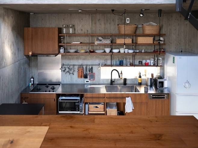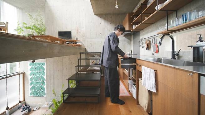 구조는 콘크리트, 가구와 바닥은 목재, 선반과 계단은 금속으로 조합해 차분하면서도 풍부한 질감을 구현했습니다. 오픈 선반과 하부 캐비닛, 플랫폼 속 수납 등 사용 빈도에 맞춘 수납 전략으로 협소주택의 한계를 극복하고, 가구와 건축을 일체화해 체감 면적을 극대화했습니다.