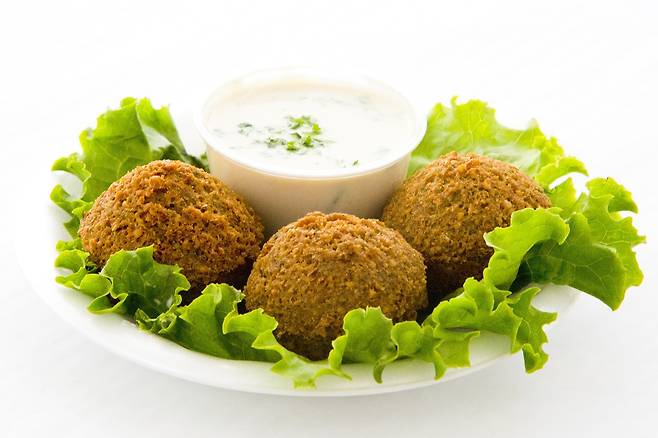 팔라펠은 병아리콩을 마늘, 고수 등의 허브와 함께 갈아 동그랗게 빚어 튀긴 중동 음식입니다.