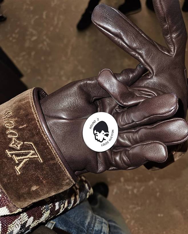 그가 착용하고 있는 브라운 계열의 레더 장갑은 벨벳 위 루이 비통의 자수 로고가 인상적이다. 일반 장갑에 비해 길이감이 긴 편이지만, 로고가 나오게 장갑을 접어 코디할 수 있다. 또, 루이비통 심볼이 이어진 체인이 있어 포인트로 살릴 수 있다.