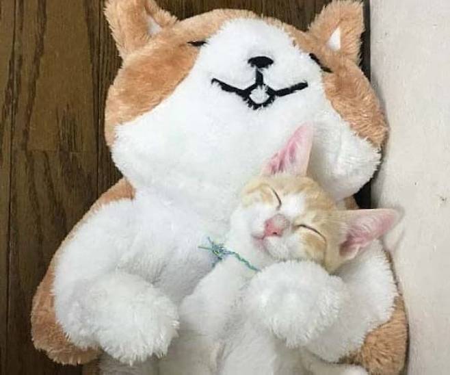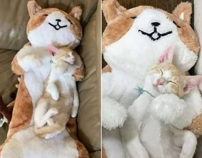 두 아기 고양이 모두 대형 고양이 인형의 품에 안겨서 잠자는 것은 물론 인형에게 꾹꾹이를 하는 등 자기 엄마라고 생각한 모양이었습니다.