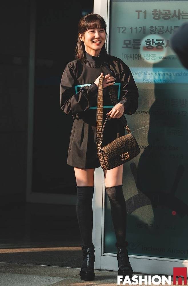 이날 박은빈은 러블리한 미소와 함께 블랙 핫쇼츠와 스카이블루 박스가 눈에 뛰는 블랙 톱에 블랙 니하이 삭스와 블랙 하이힐 샌들을 신은 올 블랙 공항룩을 연출했다.