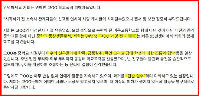 그러면서 "피해자들의 개인적인 복수의 목적이 아닌 대중의 알 권리와 인식 제고를 위한 공익 목적의 게시임을 재차 강조한다"라며 "이 글은 당시 중학교 재학생 다수의 일치된 증언, 사실에 기반하여 작성되었음을 명확히 밝힌다. 저희뿐만 아니라 당시 대전에 거주했던 94년생, 중리중학교 교직원분들께 물어도 위의 피해사실들은 모두가 공공연하게 알고 있다"고도 주장했습니다.