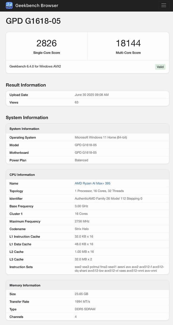 그리고 이번에 Geekbench에 등록된 ‘G1618-05’라는 모델명이 등장하면서 그 실체가 조금씩 드러나고 있습니다. 참고로, 지금까지 GPD의 Win 시리즈는 G1618이라는 코드네임을 사용해왔습니다. 예를 들어, G1618-03은 Win 3, G1618-04는 모든 Win 4 모델을 뜻했습니다. 따라서 G1618-05는 Win 4의 개량형이 아니라, 새로운 세대의 제품, 즉 Win 5일 가능성이 크다고 할 수 있습니다.