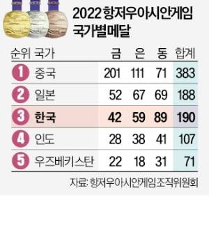 한국이 2022 항저우 아시안게임에서 금메달 42개, 은메달 59개, 동메달 89개를 수확하며 종합 3위로 대회를 마감했다. 도전장을 내며 세운 목표(금 50개·종합 3위)를 고려하면 ‘절반의 성공’이다. 하지만 대회를 마친 한국 선수단의 분위기는 그 어느 때보다 밝다.