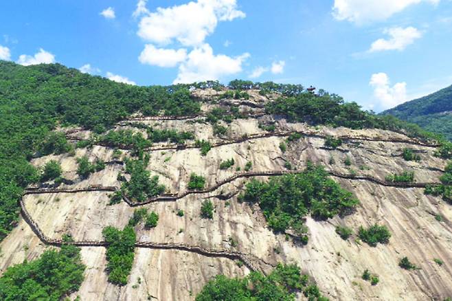 용궐산 하늘길의 입구는 매표소에서부터 시작된다. 약 10분 정도 완만한 돌계단을 따라 오르면, 어느새 수직 암벽을 가로지르는 거대한 산악 잔도길 모습을 드러낸다.