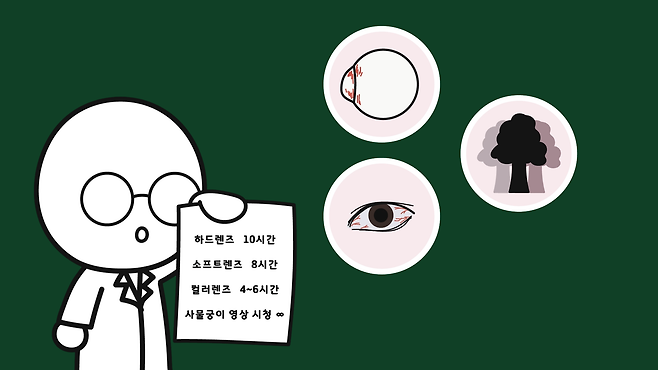또 산소 투과율이 다른 렌즈보다 상대적으로 안 좋은 편이라 장시간 착용 시 눈에 산소 공급이 원활하지 않게 됩니다. 이로 인해 각막이 부풀거나 변형되어 난시를 유발할 수 있고, 산소를 얻기 위해 혈관이 새롭게 생길 수도 있습니다.