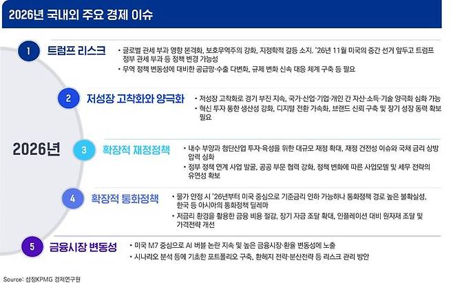 삼정KPMG 경제연구원은 "2026년은 글로벌 지정학 리스크, 기술 혁신, 정책 변화가 교차하며 복합적인 전환기"라며 "불확실성 대응을 넘어 새로운 성장 엔진을 재점화해야 할 시기"라고 강조했다. 이어 "거시 환경과 산업별 변화를 면밀히 파악하고, 성장성이 부각되는 세부 영역에 대한 선제적 대응, 전략적 포트폴리오 다각화, 신흥 시장·채널 발굴을 통해 기업별 맞춤 전략을 마련해야 한다"고 밝혔다.