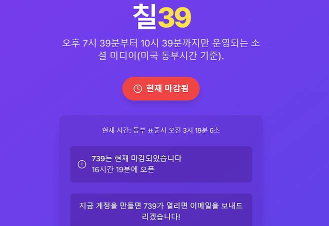 [이포커스] 매일 저녁 정해진 시간에만 문을 여는 독특한 소셜 미디어(SNS) 사이트 'seven39.com'이 등장해 주목을 받고 있다.