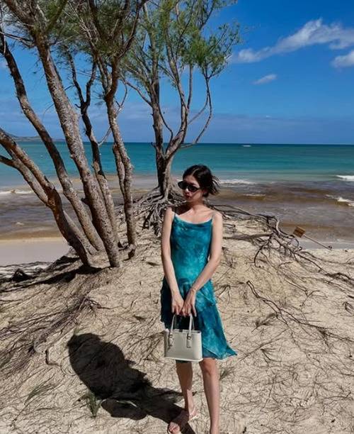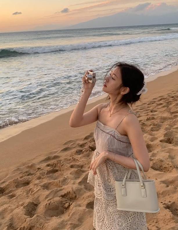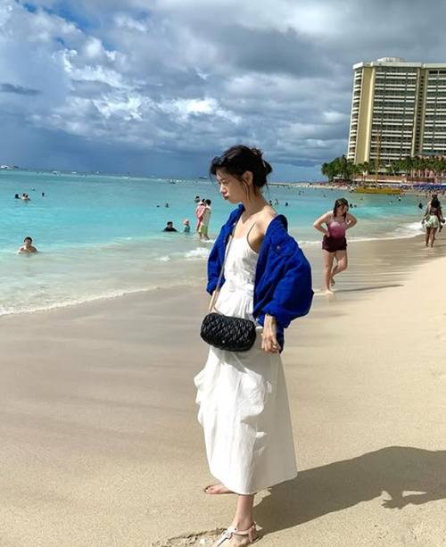 두 번째 사진에서는 화이트 컬러의 민소매 원피스와 블랙 가방을 매치해 심플한 바캉스룩의 정석을 보여주는데요. 여기에 블루 컬러의 아우터를 매치해 포인트를 준 모습이 인상적이네요.