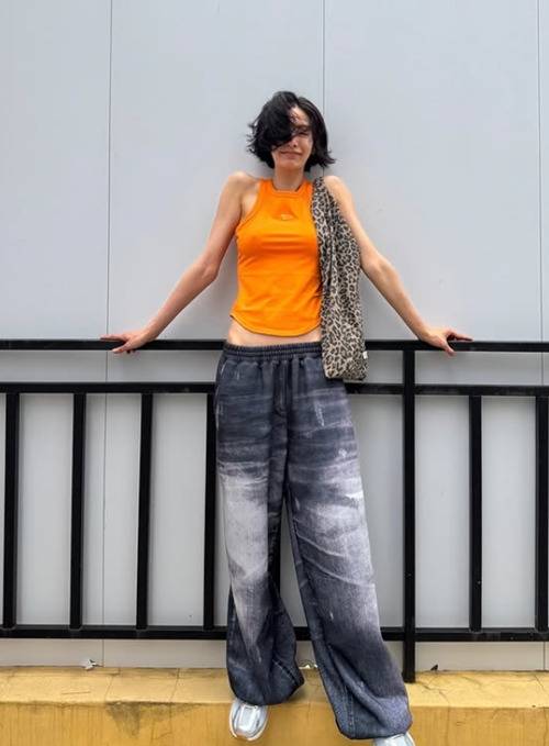 나나는 오렌지 컬러의 민소매, 청바지 그리고 운동화를 매치해 스포티한 매력이 물씬 느껴지게 만들었는데요!