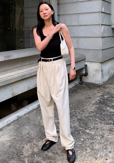 톱모델 장윤주는 블랙 민소매와 화이트 팬츠를 매치해 시크한 도시룩을 완성했는데요.