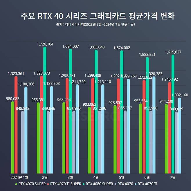 칩셋별 평균 가격 변화도 SUPER 시리즈의 성패를 잘 설명한다. 모든 전자제품이 그렇듯이 SUPER시리즈 그래픽카드도 출시된 뒤 가격이 계속 떨어졌다. 4070 SUPER의 평균 가격은 7개월 동안 약 3만 원, 4070 Ti SUPER는 7만 원, 4080 SUPER는 11만 원 정도 하락했다. 하락폭만 놓고 보면 RTX 4080 SUPER가 가장 구매 욕구를 자극한 제품군이라 할 수 있다. 심지어 6월에는 출시가에서 약 14만 원까지 내려간 가격대였기 때문에 기존 RTX 4080의 판매량 점유율을 훌쩍 상회하는 성적표를 거두었으리라 생각된다. 환율을 떠나서 RTX 4080의 출시가가 1199달러, RTX 4080 SUPER의 출시가가 999달러임을 상기해 보면 이런 가격 하락이 얼마나 소비자들에게 민감하게 받아들여지는 요소인지 충분히 가늠하고도 남는다.