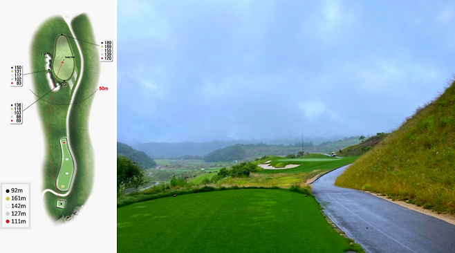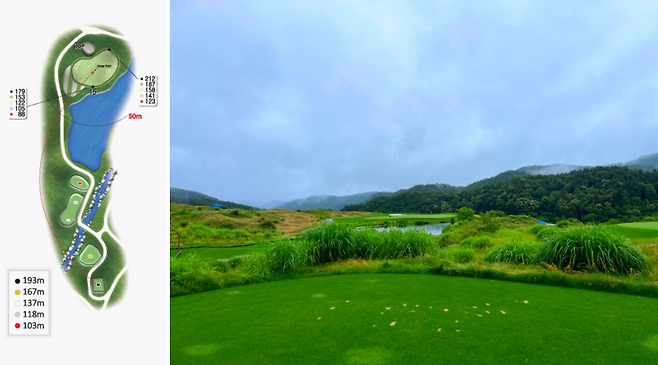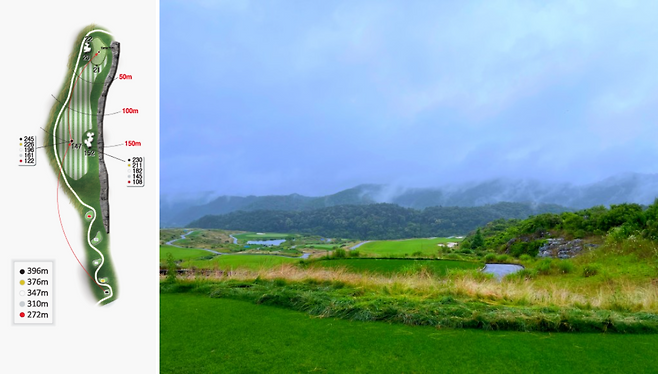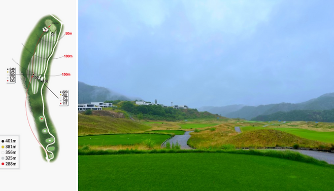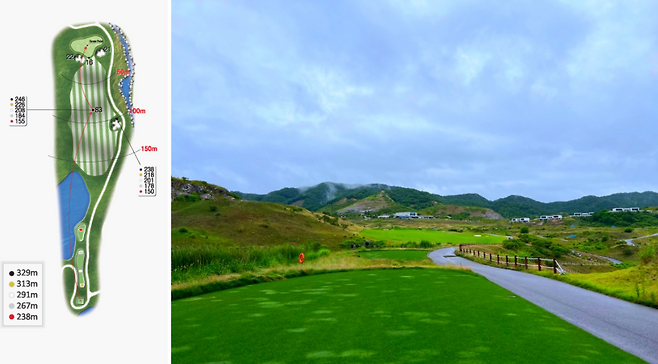 티샷 랜딩 존이 우에서 좌로 흐르는 편이라 페어웨이 좌측으로 티샷 공략되지 않게 주의하셔야 합니다.