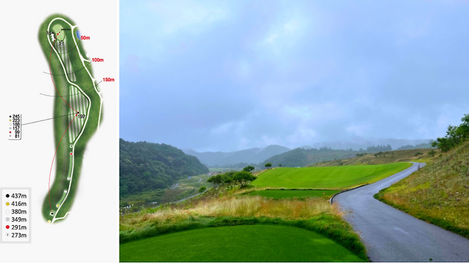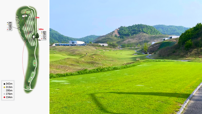 티잉 구역에 코스맵이 그려진 별도의 안내판은 없지만, 티잉 구역별로 그린 중앙까지의 거리가 표시되어 있습니다.