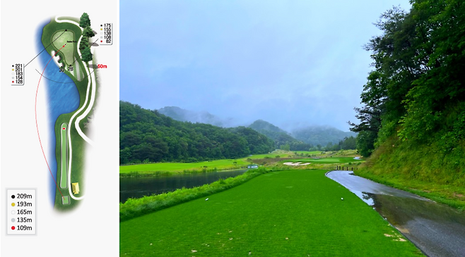 In 6번 홀. 170m 전장의 긴 파 3홀입니다. 그린 좌측으로 페널티 구역이라 핀위치와 상관없이 그린 중앙이나 우측으로 에이밍하면 좋습니다.