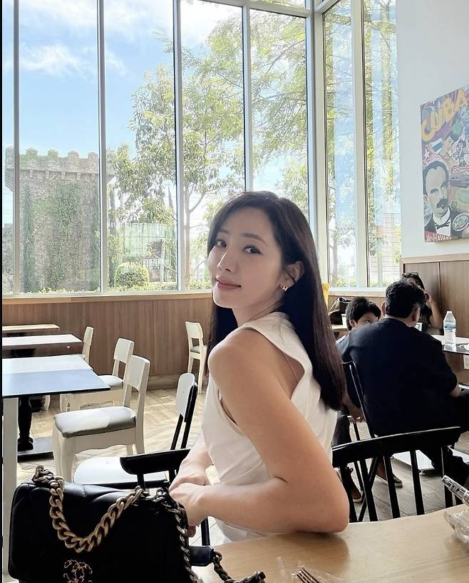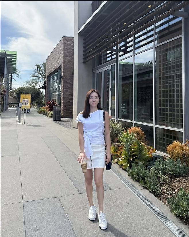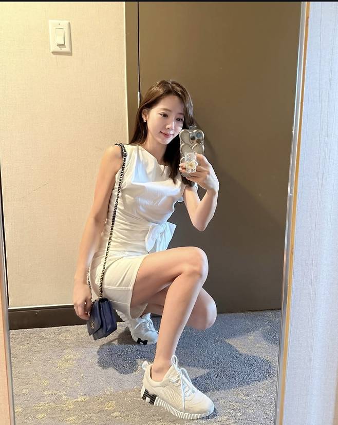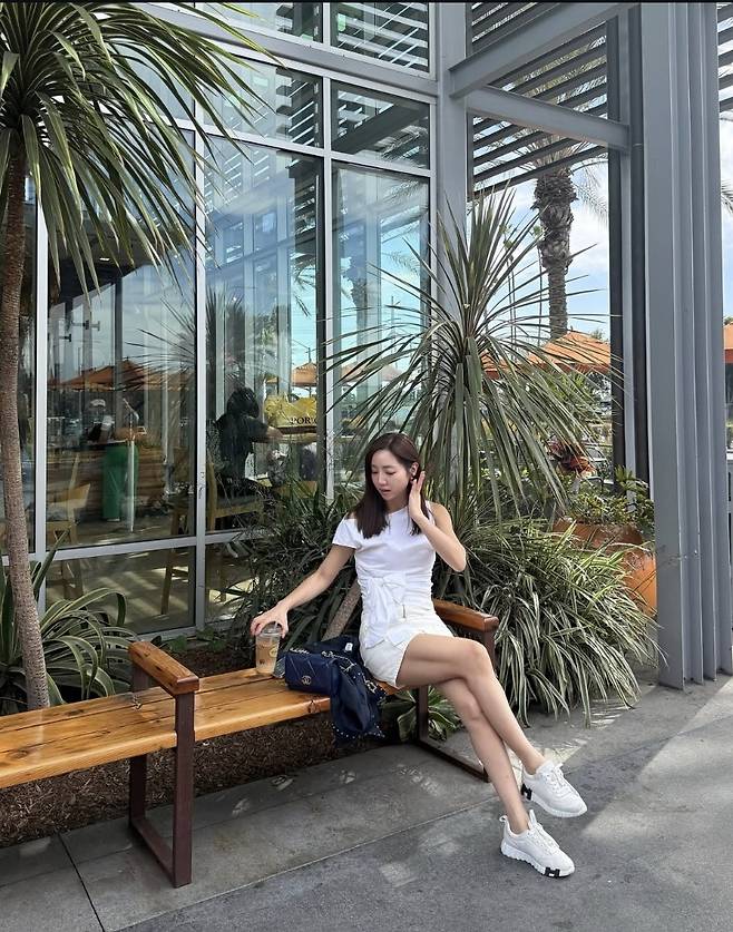 정순주는 슬리브리스 화이트 톱에 미니 스커트를 매치해 통통 튀는 썸머룩을 완성했습니다.