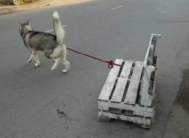 길가에 놓인 의자에 묶어 놓았던 시베리안 허스키 강아지가 의자를 질질 끌며 도로 위를 걸어가고 있었던 것입니다.