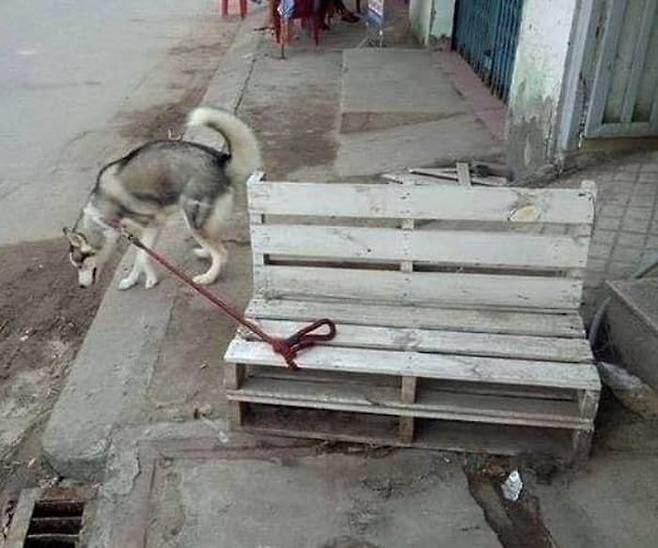 한참 고민하던 집사는 강아지를 맡아줄 사람도 없었기에 때마침 길가에 놓여진 의자를 발견, 그곳에 시베리안 허스키 강아지를 묶어놓고 볼일을 보기로 했습니다.