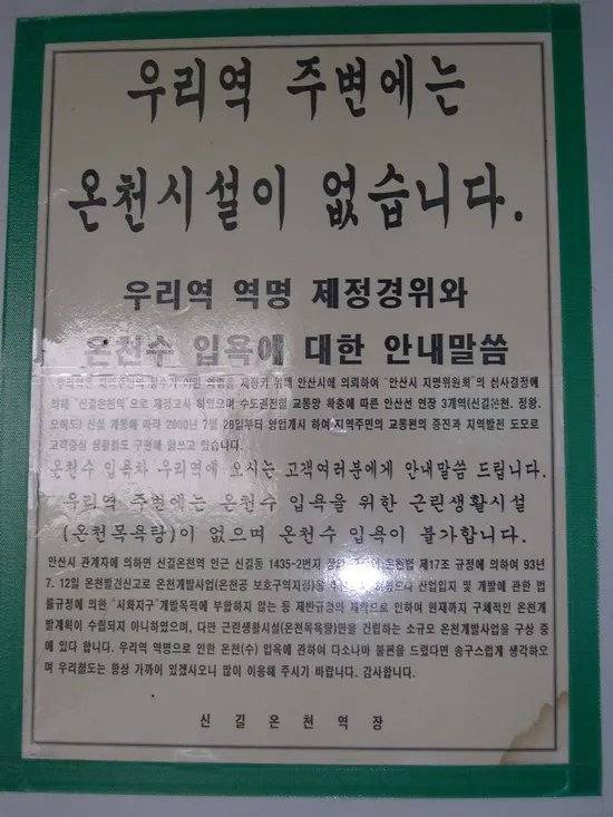 안산시에선 온천없는 온천역이어서 역이름을 바꾸려고 하고 주민들은 온천개발을 원해서 역이름 개정을 반대하는 입장이라고 하네요.