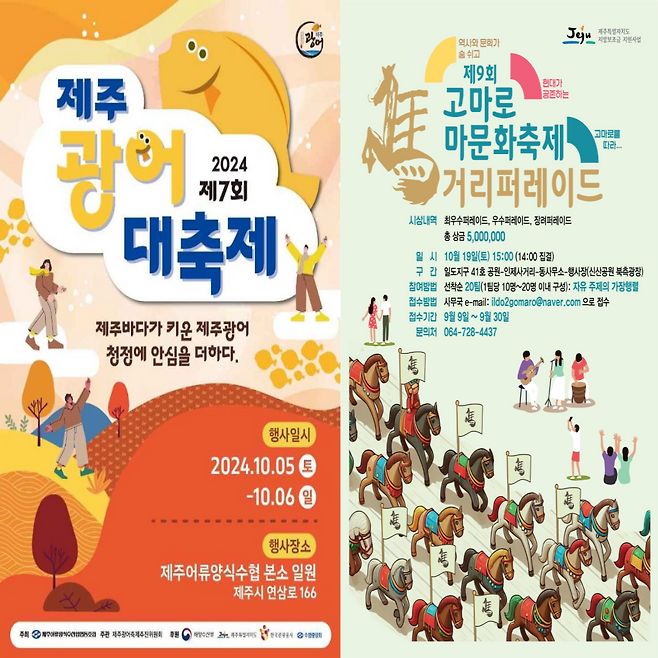 제주 여행 시 축제가 함께한다면 그 여행은 조금 더 성공한 여행이 될 것입니다. 제주도의 먹거리부터 다양한 체험이 있는 축제가 진행될 예정으로 미리 계획을 세워 가을 제주 여행을 계획해 보는 것은 어떨까요?