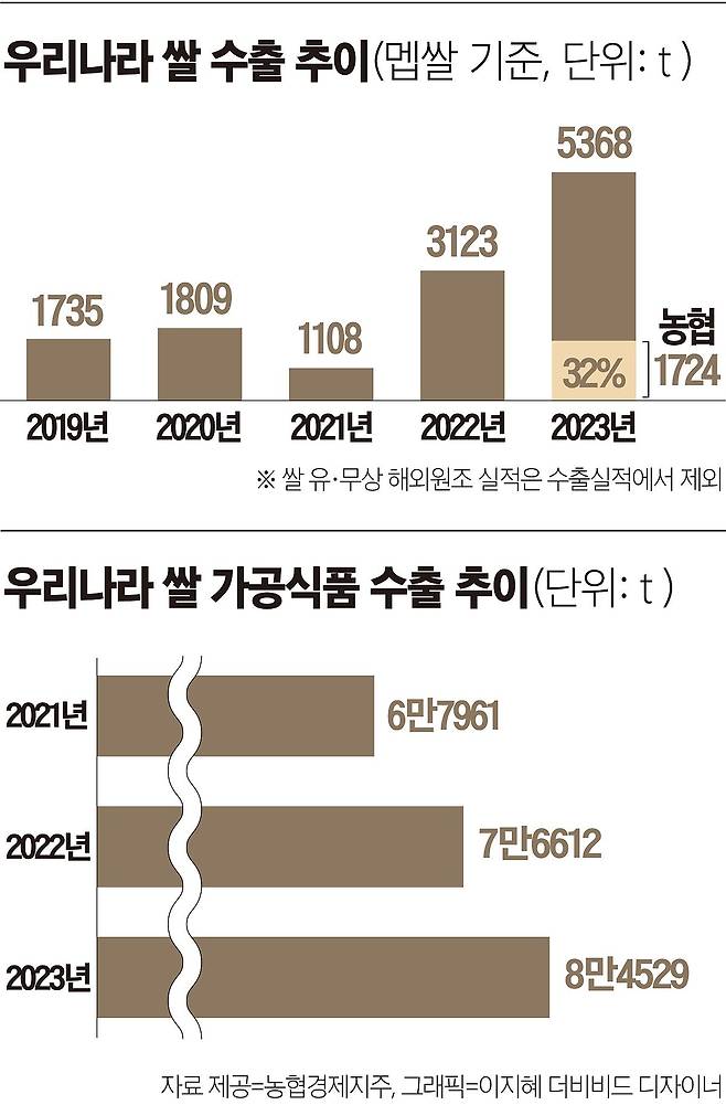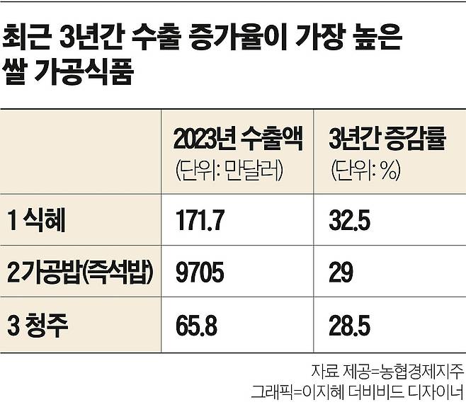 우리 쌀로 만든 가공식품도 수출 효자 품목으로 떠오르고 있다. 2023년 우리나라 쌀 가공식품 수출액은 2억1700만 달러로 2년 전보다 32% 증가했다. 농협의 경우 올해 들어 8월까지 96만2000달러의 쌀 가공식품 수출실적을 기록했다. 작년 같은 시기(79만 달러)보다 21.8% 증가한 것이다.
