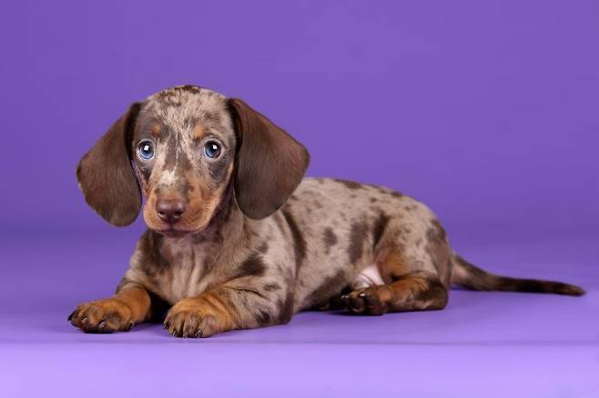 닥스훈트는 짜리몽땅한 다리와 긴 허리가 특징인 견종이에요. 스탠다드와 미니어쳐 두 가지 크기로 나누는데요. 스탠다드 닥스훈트는 키(체고) 20~22cm, 몸무게 7~14kg 그리고 미니어쳐 닥스훈트는 키(체고) 12~15cm, 몸무게 5kg 미만이에요. 닥스훈트의 점박이 무늬는 대부분 멀 유형으로 나타납니다.
