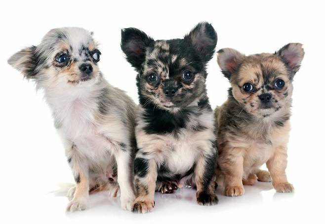 치와와는 키(체고) 12~20cm, 몸무게 3kg 이하의 작은 소형견입니다. 앞서 설명한 그레이트 데인과는 달리 세상에서 가장 작은 강아지로 여러 번 기네스북을 갱신했어요. 현재 세상에서 가장 작은 강아지는 몸무게 453g, 키(체고) 9.65cm의 밀리라는 치와와랍니다. 치와와의 경우 멀 혹은 얼룩무늬(Spotted) 유형의 점박이 무늬가 나타납니다.