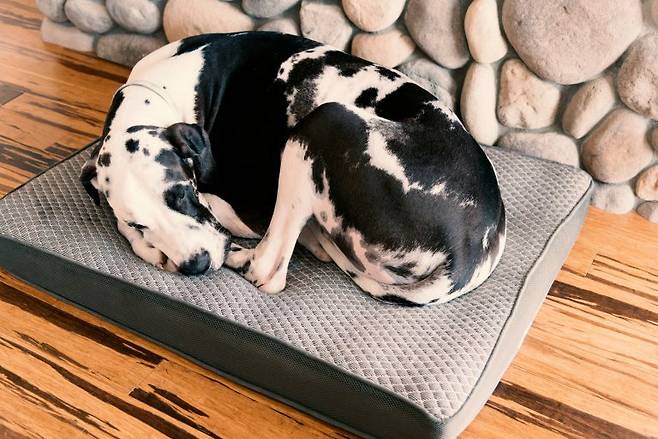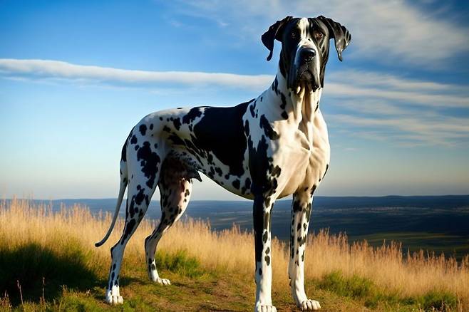그레이트 데인은 세상에서 가장 큰 개로 기네스북을 5번이나 갱신한 초대형견이에요. 키(체고)는 71~81cm, 몸무게는 50~80kg 정도입니다. 그레이트 데인의 경우 할리퀸 유형의 점박이 무늬가 나타나는 경우가 많습니다.