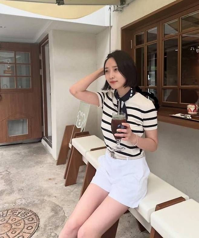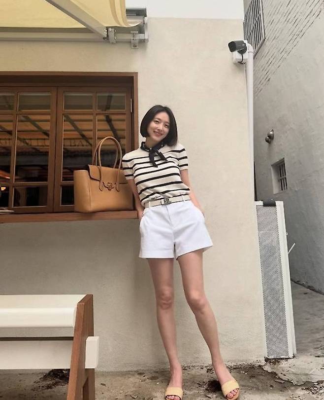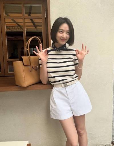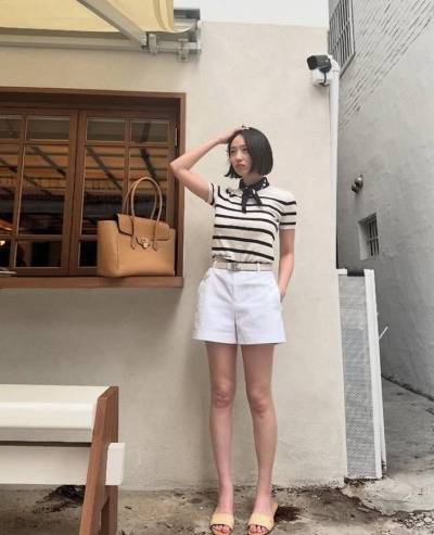 또 다른 사진에서는 스트라이프 니트 톱과 화이트 쇼츠를 매치해서 시원하면서도 세련된 룩을 연출했어. ⚓️ 목에 살짝 묶은 스카프 디테일이 진짜 킬링 포인트! 🧣 단정하면서도 시크한 분위기가 완전 내 스타일이야! 😍