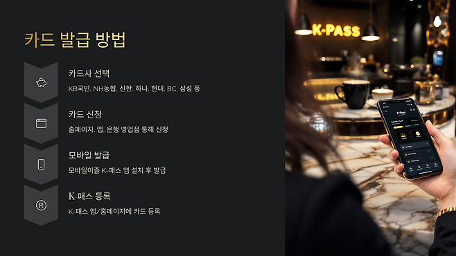카드사 선택: 평소 이용하는 주거래 은행 또는 선호하는 카드사의 K-패스 상품을 선택합니다. 현재 KB국민카드, NH농협카드, 신한카드, 하나카드, 현대카드, BC카드, 삼성카드 등 여러 카드사에서 K-패스 카드를 발급하고 있습니다.