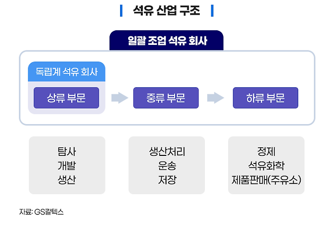 석유산업의 구조는 크게 상류 부문(Upstream), 중류 부문(Midstream), 하류 부문(Downstream)으로 나눌 수 있으며, 상황에 따라 중류 부문을 하류 부문에 포함시켜 구분하기도 합니다. 물의 흐름이 상류에서 하류로 흘러가는 것을 연상하면 기억하기 쉽습니다.