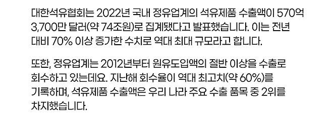 글로벌 에너지 기업, 비피(BP, British Petroleum)가 발간하는 보고서에 의하면 한국 정유회사들의 정제 설비 능력은 미국, 중국, 러시아, 인도에 이어 세계 5위를 기록할 정도로 세계적인 경쟁력을 보유하고 있는데요.